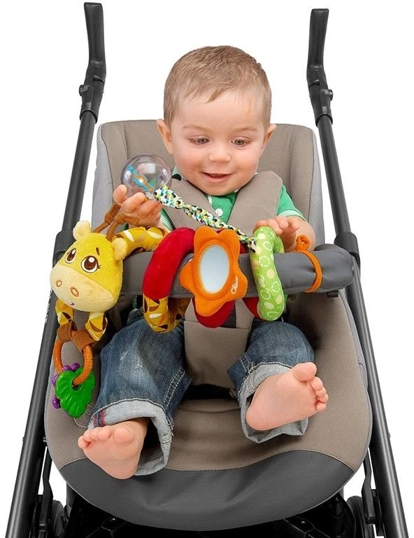 Ένα χρωματισκό παιχνίδι δραστηριοτήτων για το καρότσι, προσφέρει στο παιδί ατελειωτη διασκέδαση και αμέτρητες δρστηριότητες. Διαθέτει καθρέφτη, έναν κρίκο απ’ όπου κρέμονται μαλακά πλαστικά φυλλαράκια, μια περιστρεφόμενη μπαλίτσα με χρωματιστά μπαλάκια και πεταλούδες που κουδουνίζουν και κάνουν αστείους ήχους. Τοποθετείται εύκολα στην μπάρα του καροτσιού.
