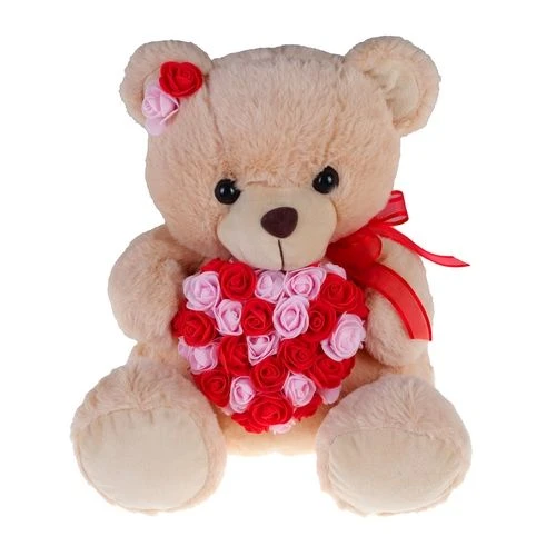 Λούτρινο Αρκουδάκι Μπεζ με Καρδιά και Λουλούδια