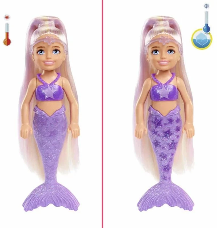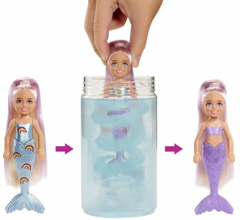Η εμφάνιση κάθε κούκλας παραμένει ένα μυστήριο μέχρι να αποκαλυφθεί. Η συσκευασία είναι μέρος της διασκέδασης-τραβήξτε την ταινία για να αφαιρέσετε το εξωτερικό στρώμα και να αποκαλύψετε ένα διαφανές σωληνάριο. Στο εσωτερικό του υπάρχει μια κούκλα γοργόνα Color Reveal™ Chelsea™, της οποίας η πλήρης εμφάνιση κρύβεται πίσω από τη μεταλλική επίστρωση σε μπλε της θάλασσας και το χρώμα του ουράνιου τόξου, και τέσσερις σακούλες με εκπλήξεις. Αφαιρέστε τα πάντα και γεμίστε το σωληνάριο με ζεστό νερό, στη συνέχεια τοποθετήστε την κούκλα και στροβιλίστε την. Το νερό παίρνει ένα λαμπερό μπλε της θάλασσας και όταν τραβήξετε την κούκλα έξω, αποκαλύπτονται τα χαρακτηριστικά της! Κάθε κούκλα γοργόνα Chelsea™ αντιπροσωπεύει ένα διαφορετικό χρώμα του ουράνιου τόξου με μακριά, χρωματιστά μαλλιά και μια ουρά με μοτίβο, και οι εκπλήξεις συνεχίζονται… ανοίξτε τις σακούλες για να ανακαλύψετε ένα κλιπ στο πάνω μέρος, ένα κλιπ στο χτένισμα πτερύγιο ή μανσέτες στους καρπούς, ένα στεφάνι στο κεφάλι και ένα σφουγγάρι από κοχύλια. Τα εφέ αλλαγής χρώματος στην ουρά προσθέτουν στην έκπληξη και τη διασκέδαση. Κάθε σειρά έχει ένα μοναδικό θέμα, αυτές οι κούκλες Color Reveal™ Chelsea™ έχουν να κάνουν με τα ουράνια τόξα και τις γοργόνες. Χρησιμοποιήστε το σωληνάριο για να αποθηκεύσετε αυτές και άλλες αγαπημένες σας κούκλες. Ποια κούκλα θα αποκαλύψετε; Περιλαμβάνονται: