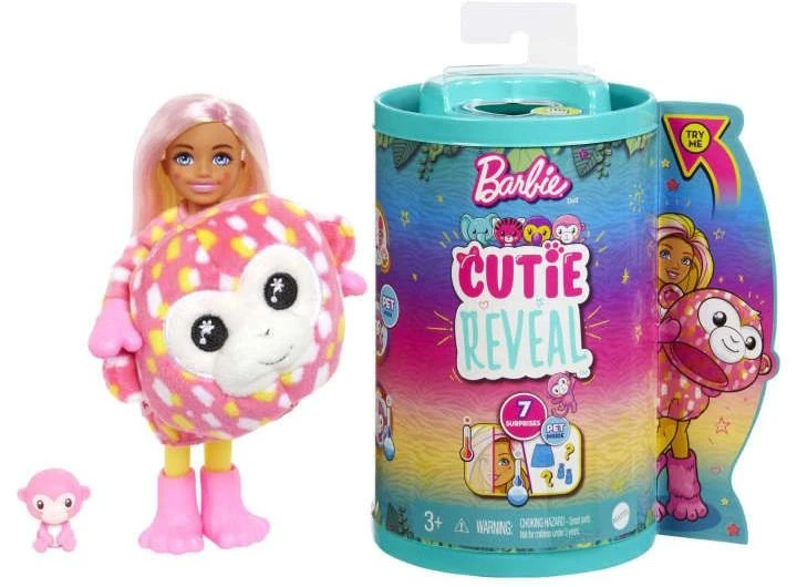 Οι κούκλες Barbie® Cutie Reveal™ προσφέρουν την πιο χαριτωμένη εμπειρία αποκάλυψης με επτά εκπλήξεις! Ανακαλύψτε ένα αστείο μαϊμουδάκι και στη συνέχεια αφαιρέστε τη στολή για να αποκαλύψετε μια ευλύγιστη μικρή κούκλα Chelsea™. Κάθε μικρή κούκλα έχει σχέδια στο πρόσωπο που κάνουν την εμφάνισή της ακόμα πιο χαριτωμένη. Αποκαλύψτε περισσότερες εκπλήξεις, όπως μια φούστα και ένα μίνι ζωάκι που ταιριάζει με τη στολή της κούκλας! Το επάνω μέρος της στολής αναποδογυρίζει και γίνεται over-sized μπλούζα, ενώ και το κεφάλι μετατρέπεται σε κρεβάτι για ζωάκι. Το παγωμένο νερό προσθέτει ακόμα περισσότερα παιχνίδια με την αλλαγή χρώματος της κούκλας και του μικρού ζώου. Το ζεστό νερό επαναφέρει τις εμφανίσεις τους για διασκέδαση ξανά και ξανά!