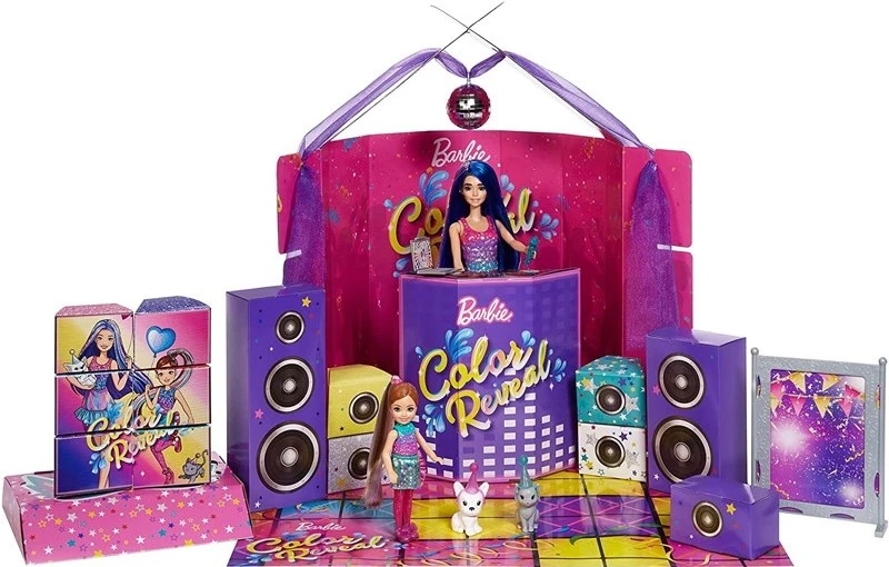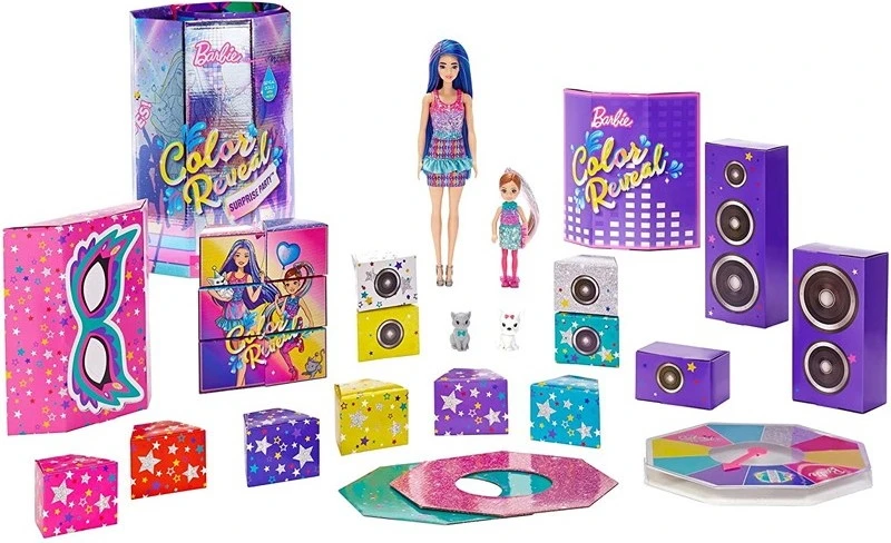 Αυτό το σετ Barbie® Color Reveal™ κρύβει περισσότερες από 50 εκπλήξεις, όπως μία κούκλα Barbie® και μία κούκλα Chelsea™ με ασημί μεταλλική εμφάνιση με πολύχρωμα κομφετί αστέρια, και δύο ζωάκια Color Reveal™ με μεταλλικό ροζ και μωβ χρώμα!