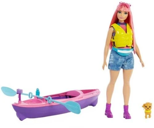 Η Νταίζη πάει ένα ταξίδι με το κανό, μαζί με το κουτάβι της. Εκτός από το καγιάκ, φυσικά, έχει ένα σωσίβιο για τον εαυτό της και το κατοικίδιό της, μια τσάντα ζώνης, ένα μπουκάλι νερό, μια κάμερα και μια βάση κάμερας. Ντύστε την Daisy και το κουτάβάκι της με τα σωσίβια τους και τοποθετήστε τα στο καγιάκ – υπάρχει ένα ειδικό κάθισμα για το κουτάβι! Οι λαβές στο κουπί διευκολύνουν την κούκλα Daisy να τις πιάσει, μια κάμερα δραστηριοτήτων τοποθετείται στο μπροστινό μέρος του καγιάκ για να απαθανατίσει το ταξίδι της και περιλαμβάνεται ένα μπουκάλι νερό για να την κρατά ενυδατωμένη όλη την ημέρα. Η κούκλα Daisy είναι εμπνευσμένη από την επιτυχημένη σειρά Barbie, It Takes Two! Ντύστε την κούκλα Daisy και το κουτάβι της με τα σωσίβια τους και βάλτε τα στο καγιάκ. Μετά κάντε κουπί για να διασκεδάσετε!