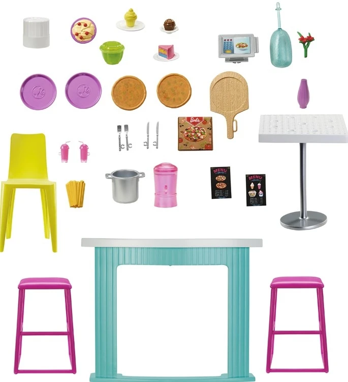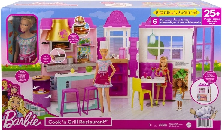 Η κούκλα Barbie® είναι έτοιμη για μια μέρα εργασίας είναι ντυμένη με ένα καλοκαιρινό φόρεμα, αξιολάτρευτη ροζ ποδιά και καπέλο του σεφ. Τα παιδιά μπορούν να την βοηθήσουν να λάβει παραγγελίες στο παράθυρο της υπηρεσίας ή να φιλοξενήσει έως 4 άτομα στον πάγκο και το αίθριο για φαγητό. Στη συνέχεια, κατευθυνθείτε στην κουζίνα για να ψήσετε μπιφτέκια στην περιστρεφόμενη σχάρα, γλυκές λιχουδιές στο περιστρεφόμενο πάσο για το επιδόρπιο, βάλτε μια πίτσα στο φούρνο και πατήστε το μοχλό για να την παρακολουθήσετε να αλλάζει χρώματα όταν “μαγειρεύεται!”