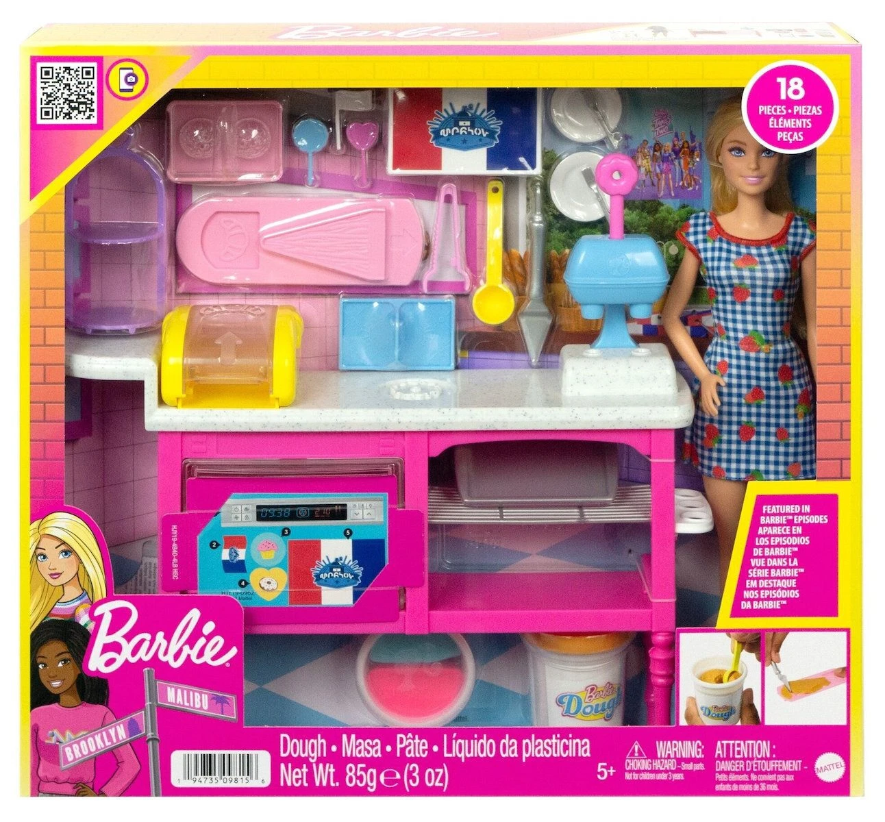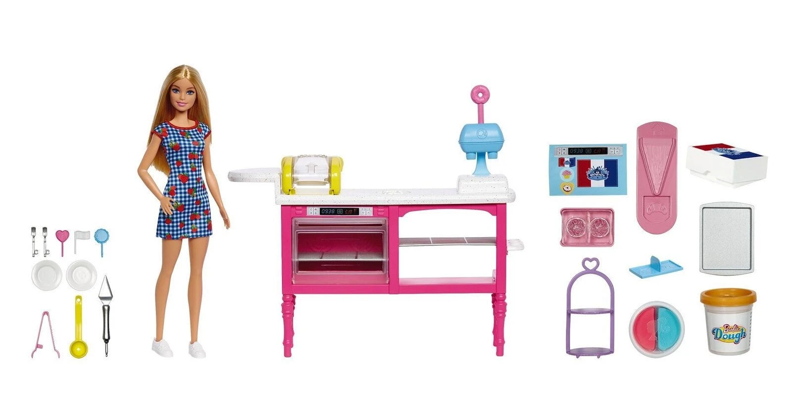 Τα παιδιά μπορούν να απολαύσουν την επόμενη μεγάλη περιπέτεια στην καφετέρια τους με την κούκλα Barbie Malibu και ένα δημιουργικό σετ παιχνιδιού με 18 αξεσουάρ. Εμπνευσμένο από τη θρυλική σκηνή της σειράς Barbie It Takes Two, ο πάγκος προσφέρει πολλούς χώρους παιχνιδιού για αφήγηση, όπως μηχανή ντόνατ, μηχανή κρουασάν και φούρνο. Οι νεαροί ζαχαροπλάστες μπορούν να ετοιμάσουν και να διακοσμήσουν ντόνατς, κρουασάν και cupcakes σε χρόνο μηδέν με πλαστοζυμαράκια σε 3 διαφορετικά χρώματα, 3 φόρμες, πλάστη και 2 μηχανές ζαχαροπλαστικής.