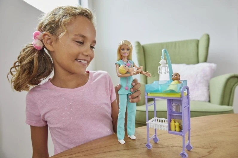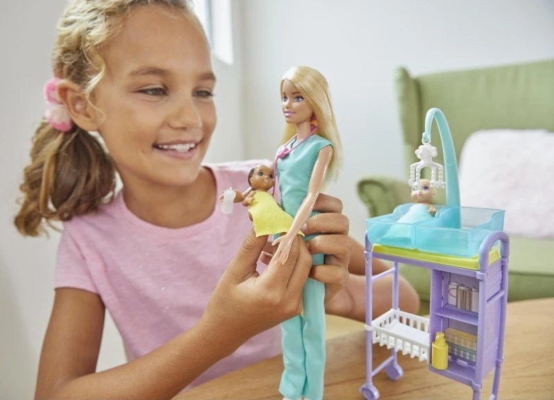 Εξερευνήστε έναν κόσμο φροντίδας με αυτό το σετ της Barbie®! Όταν ένα κορίτσι παίζει με την Barbie, φαντάζεται όσα μπορεί να γίνει όταν μεγαλώσει και αν της αρέσει να φροντίζει μωράκια, μπορεί να γίνει παιδίατρος! Το σετ περιλαμβάνει όσα χρειάζεται η Barbie για να φροντίζει τα αξιολάτρευτα μωράκια! Οι παιδίατροι είναι ευγενικοί και έξυπνοι και βοηθάνε τα μωρά να μένουν υγιή και χαρούμενα. Με έπιπλο εξέτασης, μπουκαλάκι λοσιόν, αξεσουάρ, περιστρεφόμενο και 2 κρεβατάκια για τα μωράκια. Η Barbie μπορεί να ακούσει τους χτύπους της καρδιάς των μωρών με το στηθοσκόπιο και να σημειώσει στο διάγραμμα. Είναι πολύ υγιή! Το σετ περιλαμβάνει: Barbie® Παιδίατρο με πράσινα ιατρικά ρούχα, στηθοσκόπιο και διάγραμμα, έπιπλο εξέτασης με μπουκαλάκι λοσιόν, αξεσουάρ περιστεφόμενο και κρεβατάκια για τα μωρά και 2 μωράκια τυλιγμένα σε κουβερτούλες. Τα παιδιά θα εκφραστούν δημιουργικά και θα εμπνευστούν πολλές ιστορίες με την Barbie Παιδίατρο. Η κούκλα δεν μπορεί να σταθεί όρθια από μόνη της.