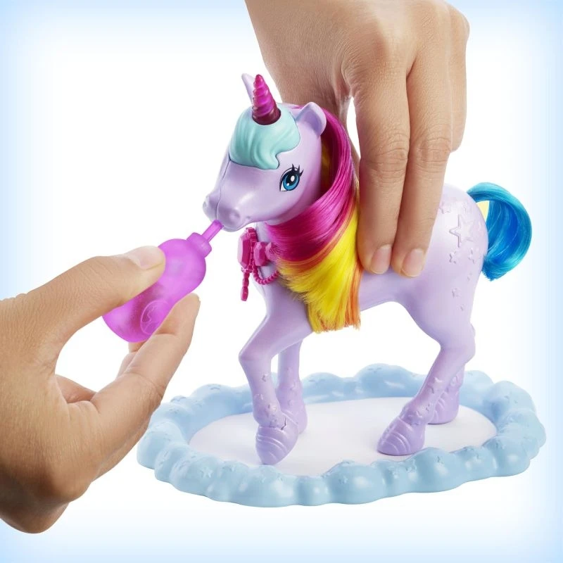 Αυτό το σετ Barbie™ Dreamtopia δίνει έμπνευση για παιχνίδι και παραμυθένια διασκέδαση με την πριγκίπισσα Barbie, τον μονόκερό της και το μαγικό εφέ αλλαγής χρώματος! Εμπνευσμένος από τα σύννεφα και το ουράνιο τόξο, ο φανταστικός στάβλος είναι το τέλειο μέρος για να φροντίσει η Barbie τον μονόκερό της. Γεμίστε το μπουκάλι με νερό, τοποθετήστε τον μικρό μονόκερο στο μαξιλαράκι-γιο γιο και βοηθήστε την Barbie να ταΐσει το ζωάκι της. Καθώς ο μονόκερος κάνει πιπί, το άσπρο μαξιλαράκι αποκτά τα χρώματα του ουράνιου τόξου! Αφήστε το να στεγνώσει και επαναλάβετε για ατελείωτο παιχνίδι. Επίσης, το σετ περιλαμβάνει μία ταΐστα και σνακ, μία βούρτσα μαλλιών για την Barbie, μία βούρτσα περιποίησης για τον μονόκερο και 10 αξεσουάρ μαλλιών για να δώσετε το δικό σας στιλ στις ιστορίες σας. Με το μαγικό εφέ αλλαγής χρώματος και τόσα αξεσουάρ, αυτό το σετ Barbie® Πριγκίπισσα και Μονόκερος είναι το ιδανικό δώρο για παιδιά ηλικίας 3 έως 7 ετών. Η κούκλα δεν μπορεί να σταθεί όρθια από μόνη της.