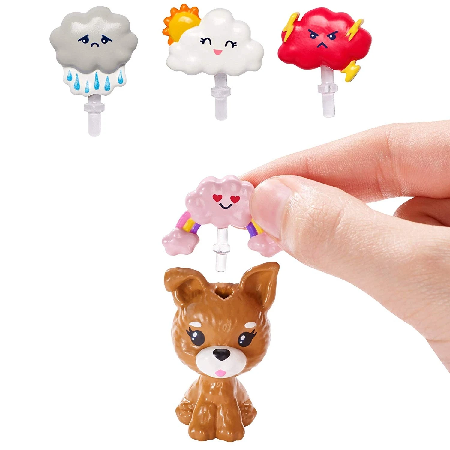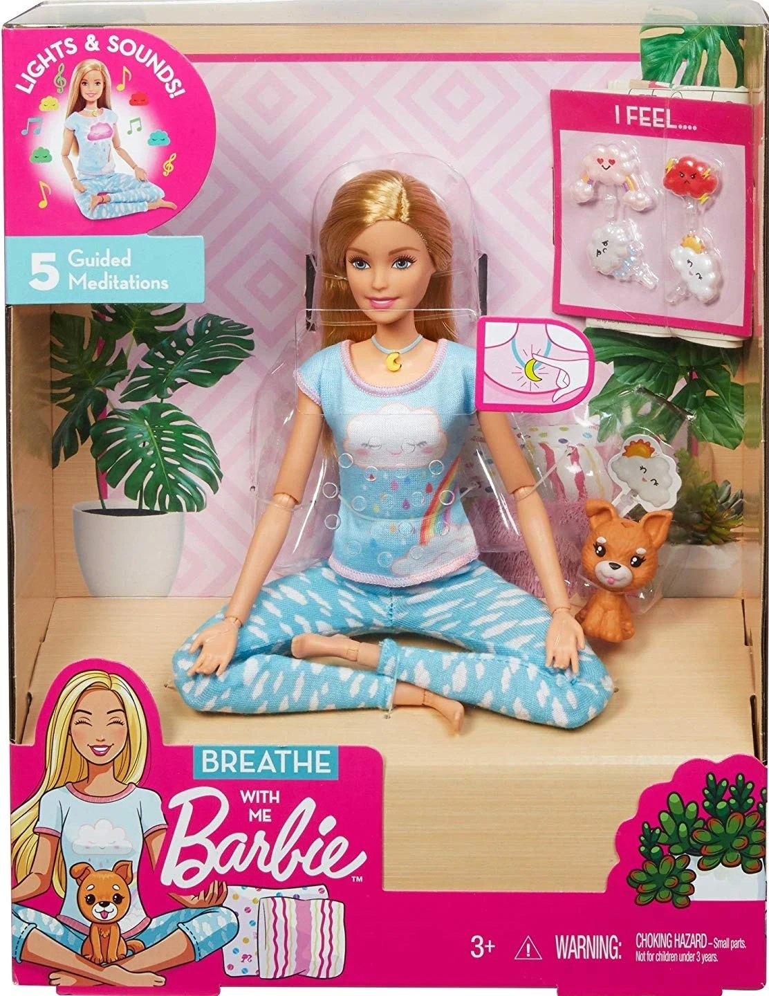Το σετ περιέχει μια κούκλα Barbie, ένα κουτάβι και τέσσερα emojis σύννεφο. Πατήστε το κουμπί στο κολιέ της κούκλας για να ενεργοποιήσετε μία από τις πέντε ασκήσεις καθοδηγούμενου διαλογισμού!