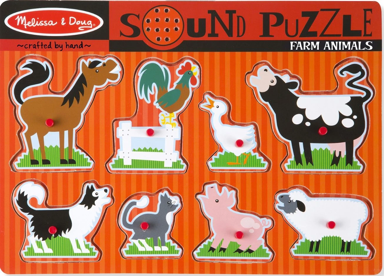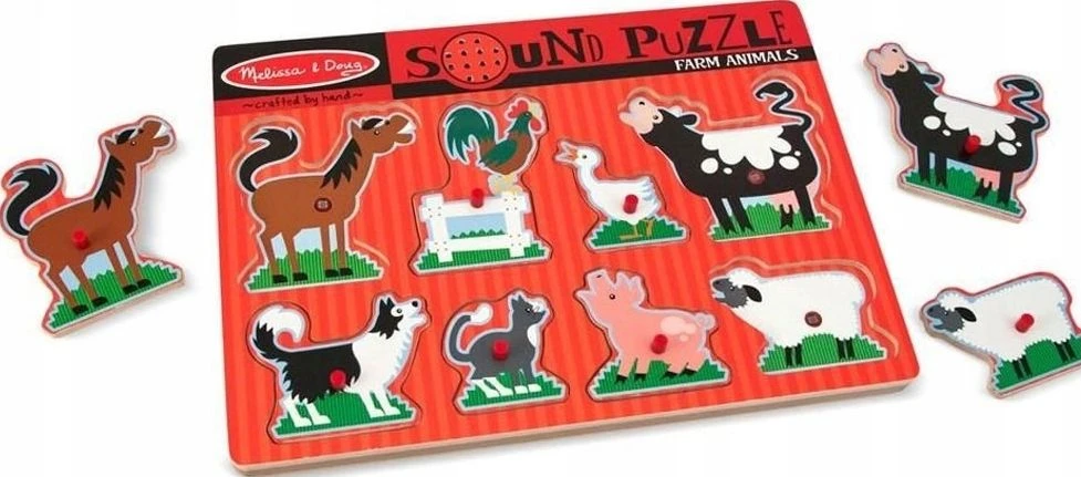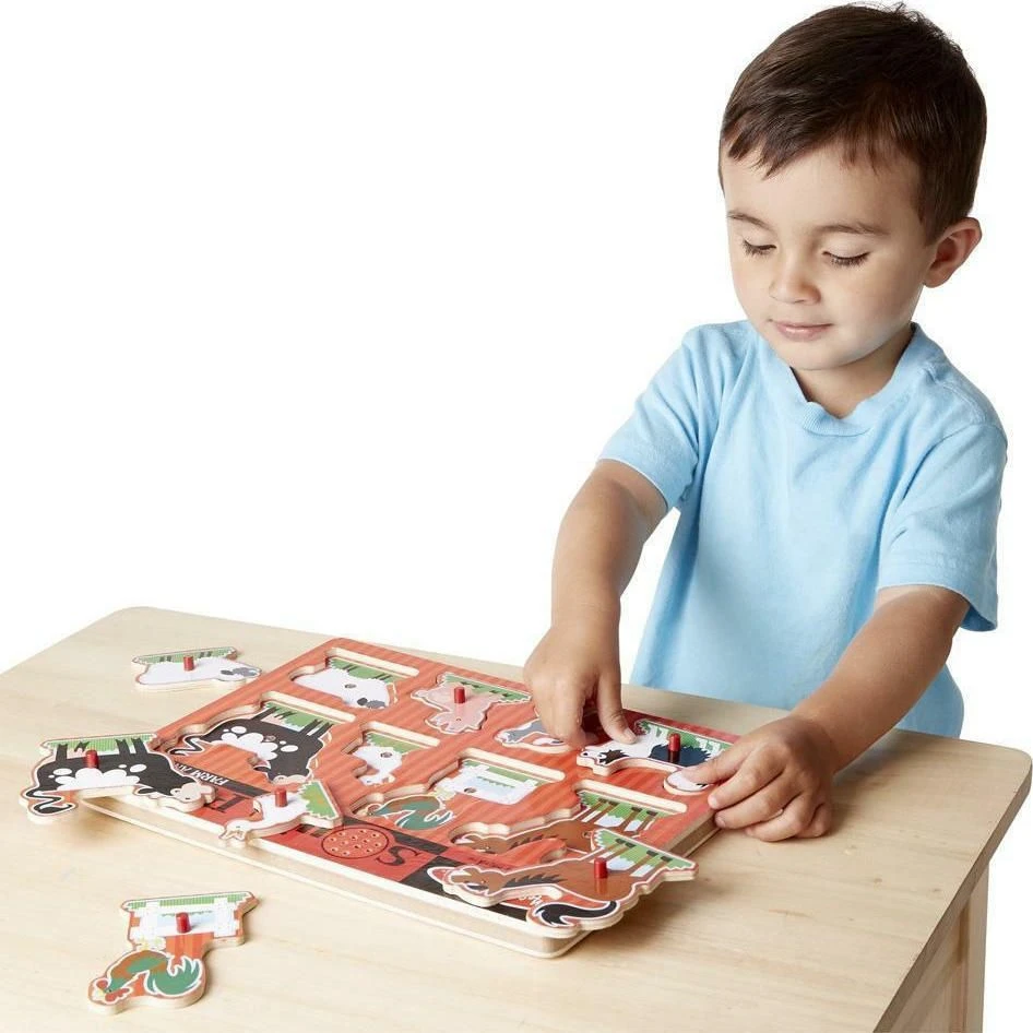Παιδικό puzzle με τρισδιάστατα σχέδια, σχήματα ή αριθμούς με θέμα ζωάκια, της εταιρίας Melissa and Doug. Απευθύνεται σε μικρές ηλικίες και ξεχωρίζει για την λαβή που διαθέτει τις περισσότερες φορές και βοηθά το παιδί ώστε να πιάσει τα κομμάτια στο χέρι του.