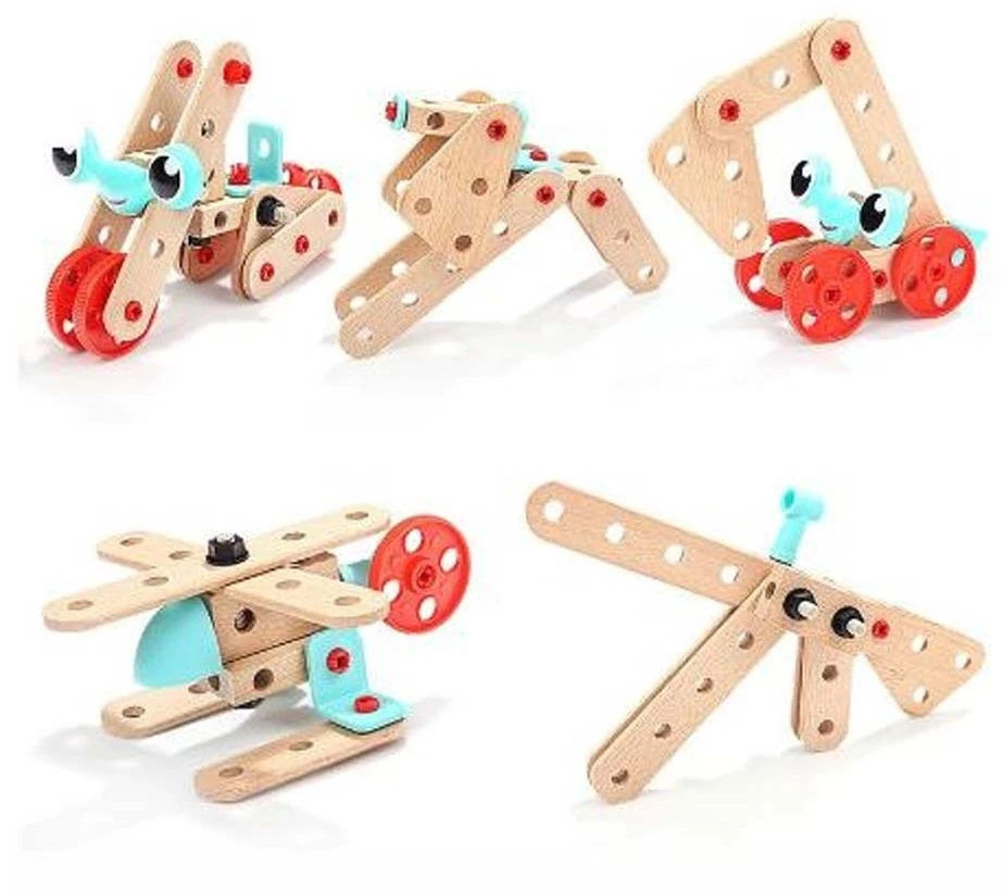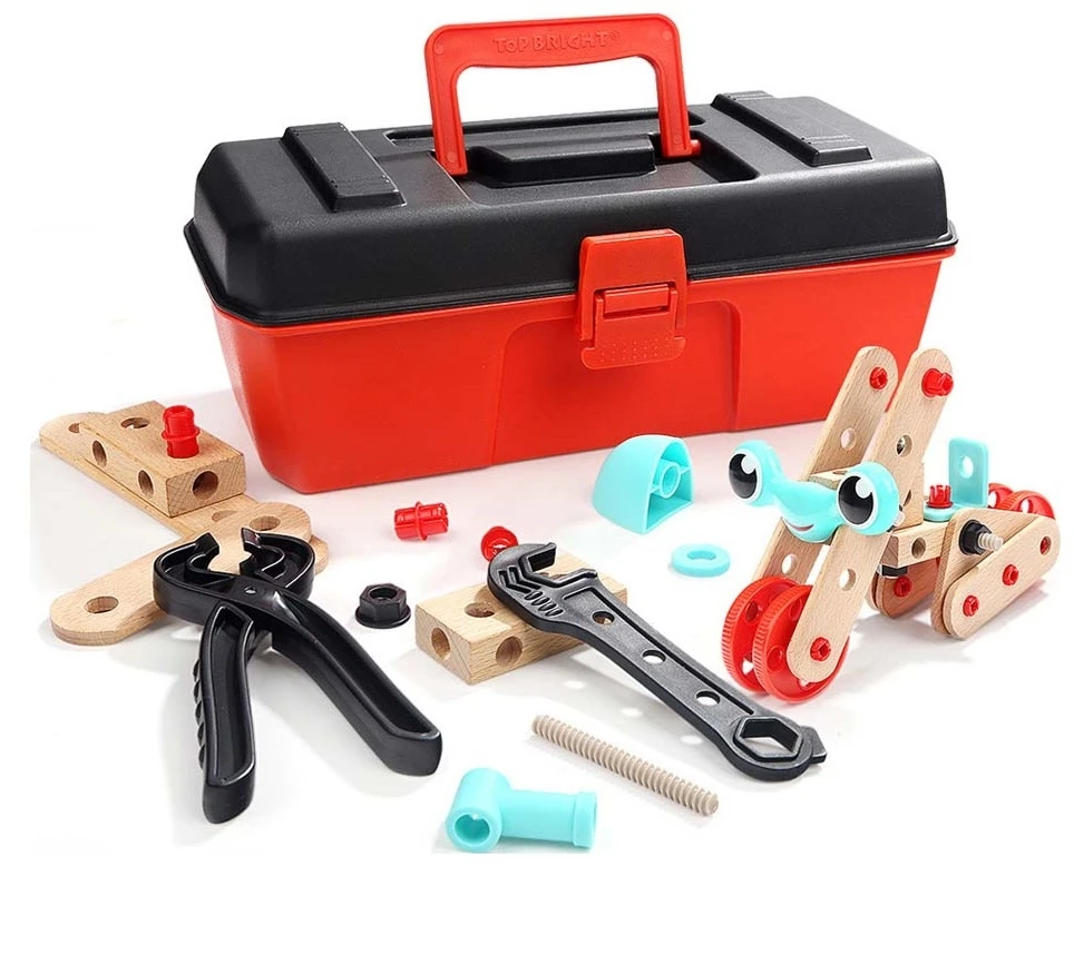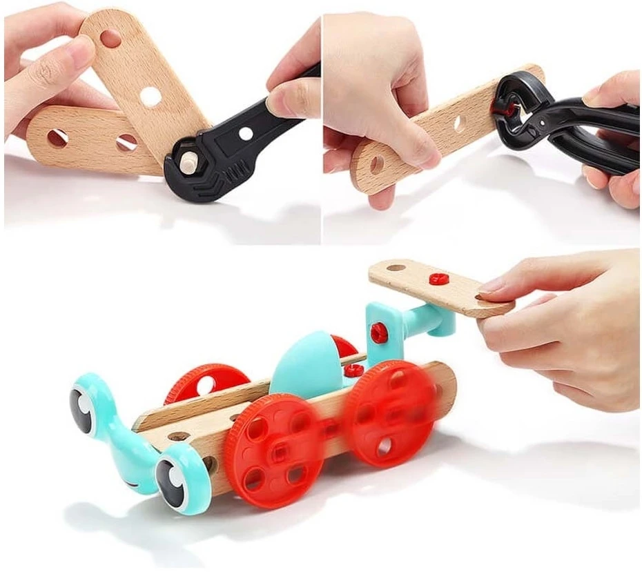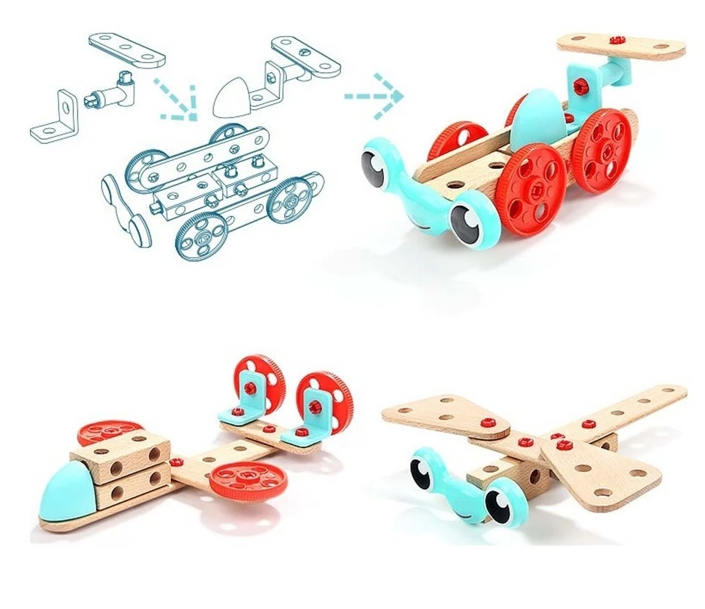 Βαλιτσάκι εργαλειοθήκη κατασκευών με 52 εξαρτήματα. Η εισαγωγή πλαστικών εξαρτημάτων σε συνδυασμό με ξύλινα δίνει τη δυνατότητα διαφοροποιημένων κατασκευών και η αποθήκευση τους σε βαλιτσάκι δίνει τη δυνατότητα μεταφοράς οπουδήποτε. Το σετ περιλαμβάνει κλειδί, τανάλια, παξιμάδια, βίδες, ρόδες, γωνίες κ.ά, ιδανική απασχόληση για άπειρες κατασκευές και δημιουργικότητα, ενώ σύνθετες συναρμολογήσεις ικανοποιούν τις ανάγκες παιδιών μεγαλύτερης ηλικίας.