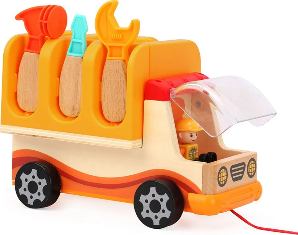 Συρόμενο ξύλινο φορτηγό με οδηγό που μεταμορφώνεται εύκολα σε πάγκο εργασίας. Διαθέτει κατσαβίδι, κλειδί και σφυρί για να βιδώσεις βίδες, παξιμάδια, σφήνες και γρανάζια στα ξύλινα κομμάτια και να φτιάξεις διάφορες κατασκευές όπως ζωάκια, οχήματα και άλλα αντικείμενα. Το παιχνίδι συνεχίζεται όταν το παιδί τοποθετήσει την φιγούρα του οδηγού στο φορτηγό και να το σύρει με το σχοινάκι.